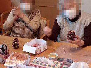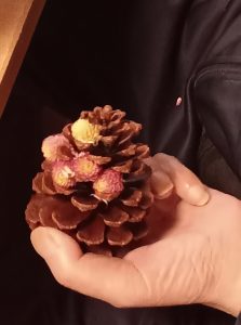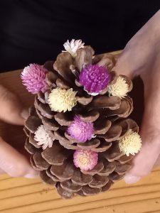 松ぼっくりにドライフラワーを詰め込んでいます。